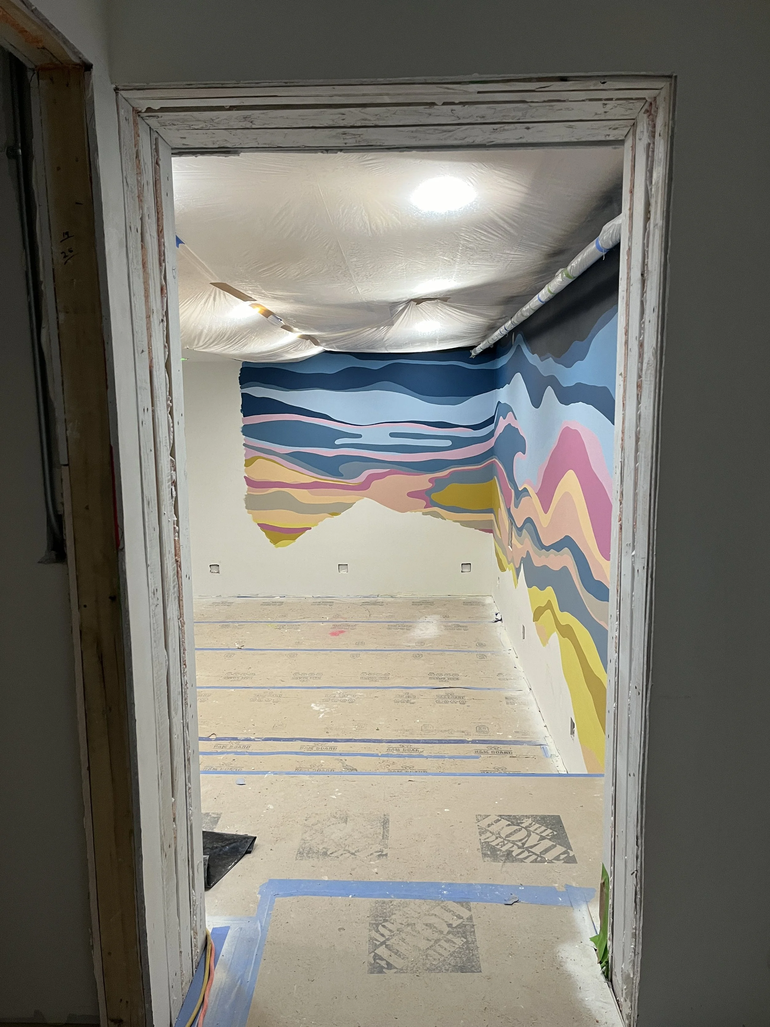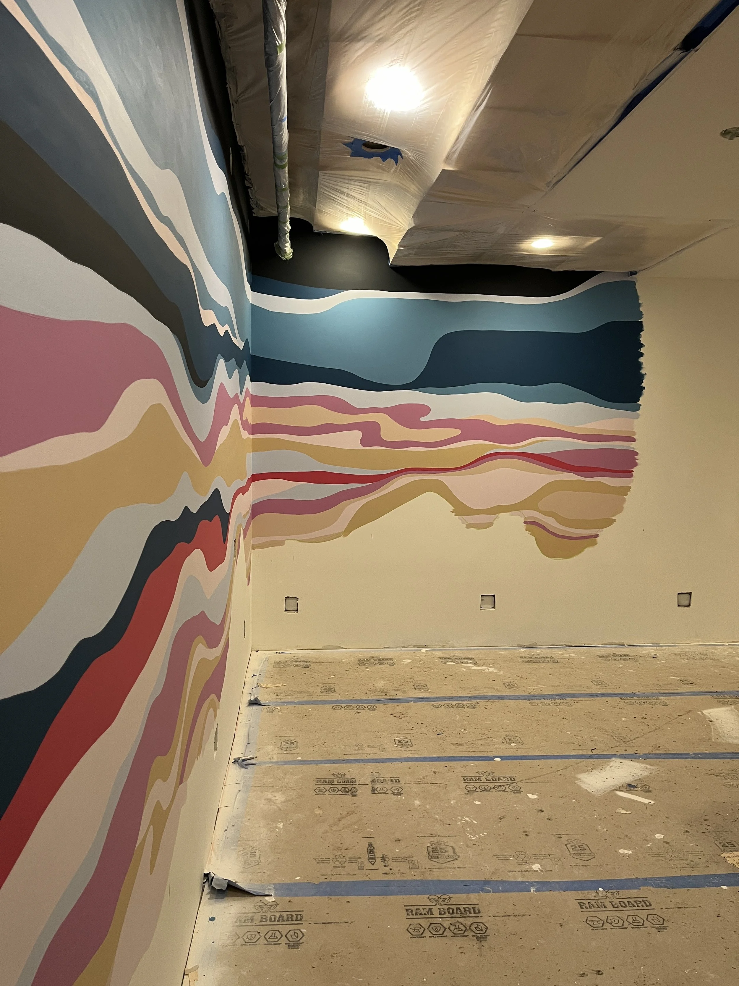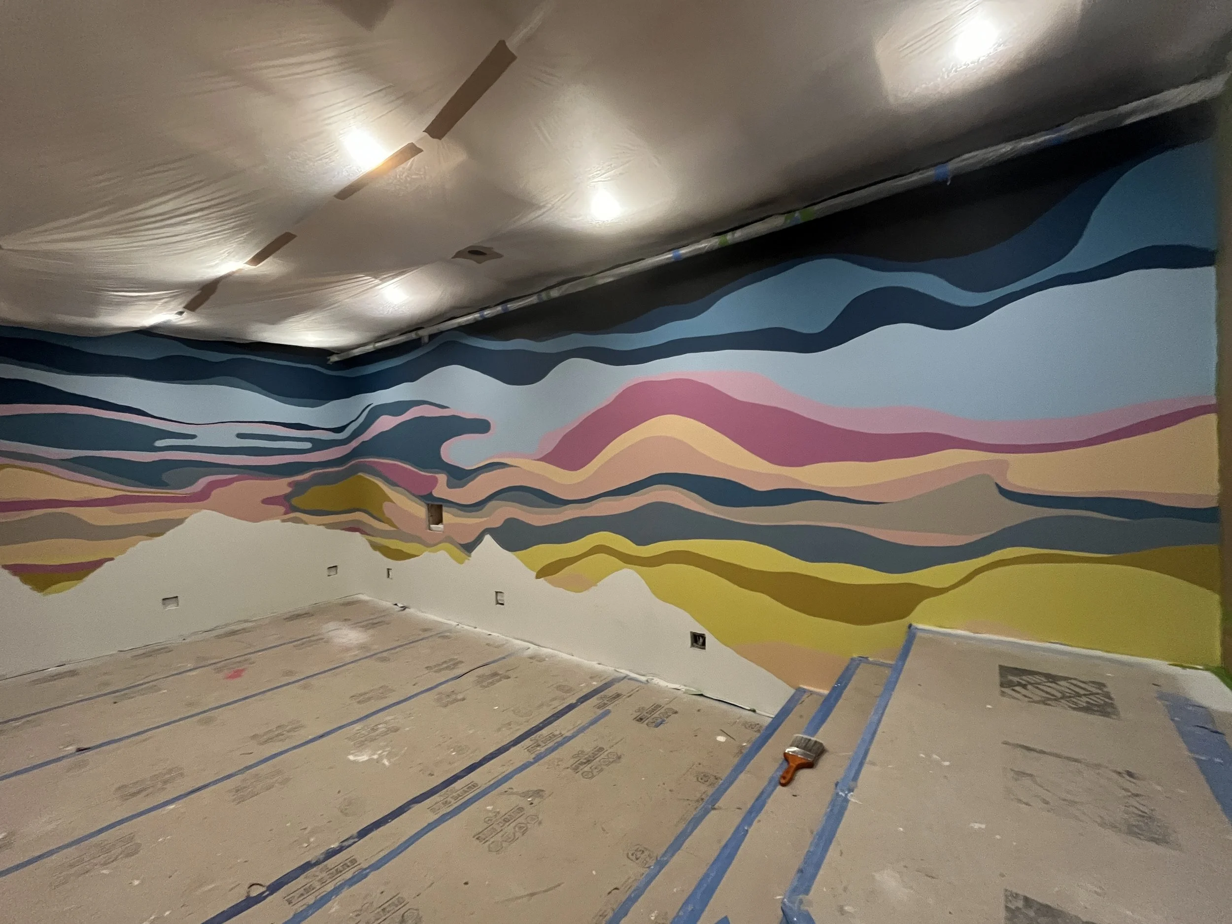 An abstract take on Colorado’s alpenglow and golden hour, this mural brings warmth and movement to Couched Media’s new studio. Subtle outlines of Mt. Sanitas and Longs Peak anchor the design, tying the space to its Colorado roots. Created as a backdrop for Pink Sofa Hour webshow and a creative hub for artists, it sets the tone for collaboration and storytelling.